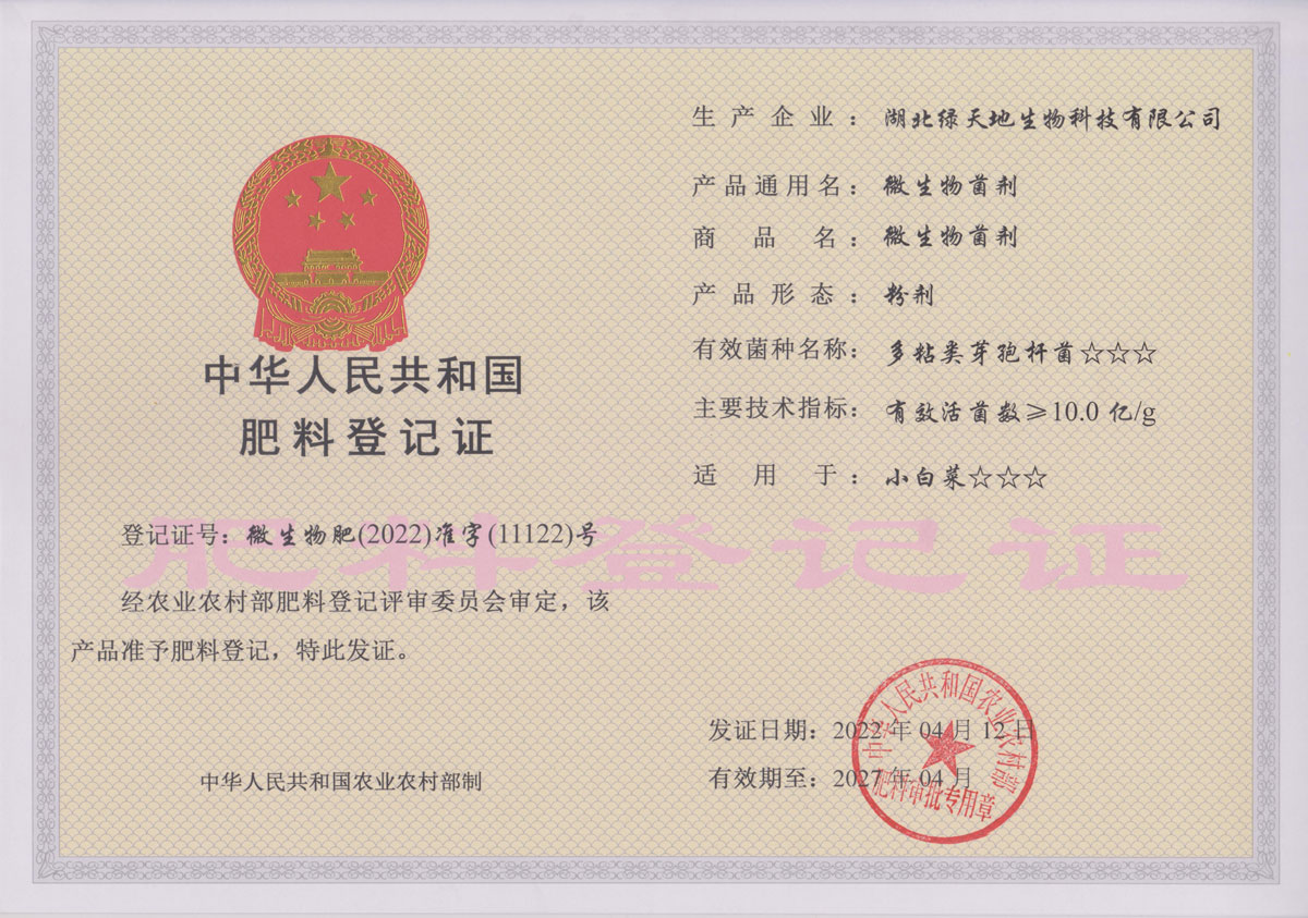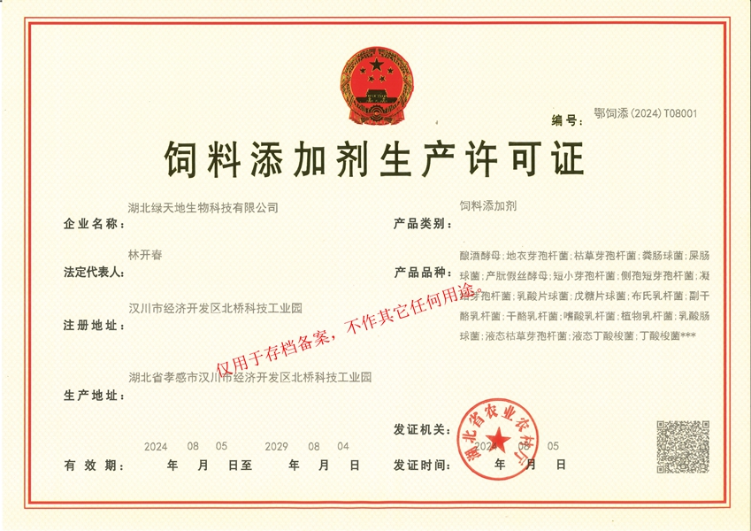 湖北綠天地生物科技有限公司 (簡稱綠天地公司)投資7000萬元,擁有25000平方米的廠房和國內先進的設備360臺套,建有微生物發酵、發酵冷凍干燥、低溫造粒等8個車間,發酵罐總容量450立方米,專業的飼用級益生菌發酵生產基地。 公司已通過IS09001:2015質量管理體系認證。 綠天地公司得到了華中農業大學、中國農...
